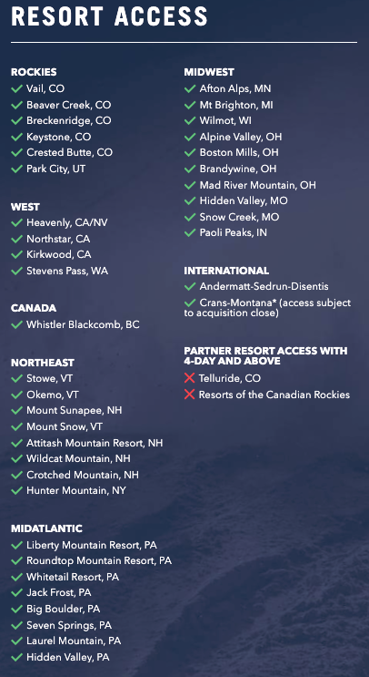 - スキーアメリカではベイルリゾート全37スキー場で使えるエピックデイパスのみを販売しています。32または22リゾートのみが使える限定券は販売しておりません。
