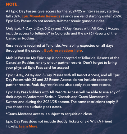 * 全37リゾートで使えるエピック1〜7日券にのみ追加ボーナス日が付与されます。32リゾート&22リゾートでのみ使える限定エピック1〜7日券には、上記の特典は含まれせせん。