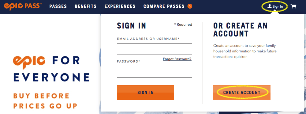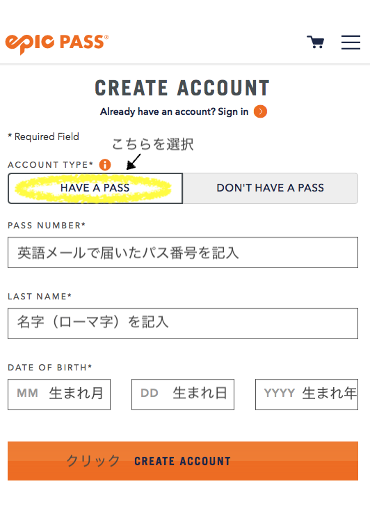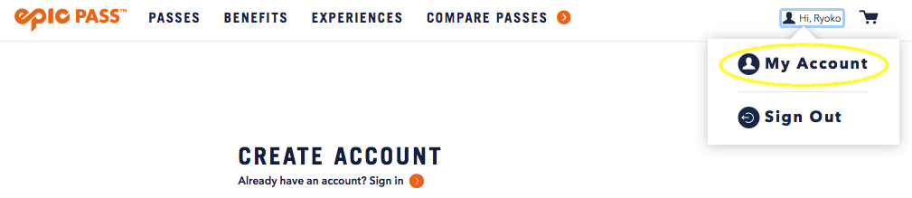 epicpass.com にアクセス。右上の sign in からCREATE ACCOUNT をクリックします。