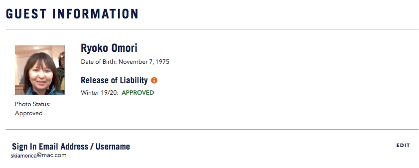 epicpass.com のアカウントにログインした際に、上記のようにご自身の写真が見られて、19/20 の横に緑の文字で APPROVED となっていれば、白馬やルスツなどの提携リゾートに行くまでにパスが届かなくても、白馬やルスツの担当者がコンピューターでこのデータにアクセスをして無料券を発行することができます。
