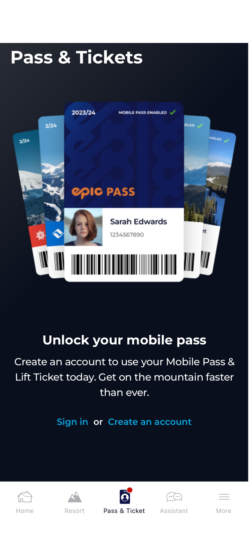Epicpass.comで利用しているEメールアドレスとパスワードでログインし、スクリーン下部の Pass&Ticket をタップ
