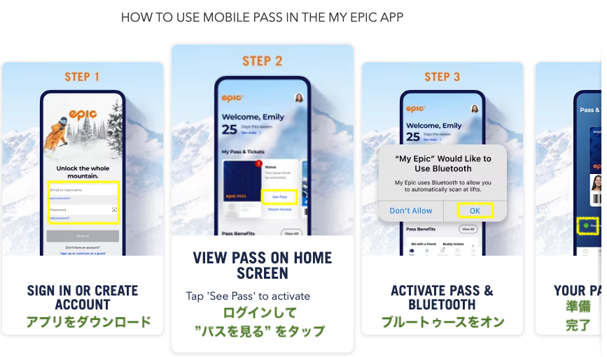 また、MY EPIC アプリをダウンロードして、モバイルパスを利用することもできます。その際は、ログイン後、Bluetoothをオンにしてください。