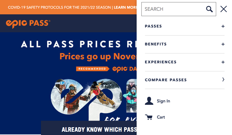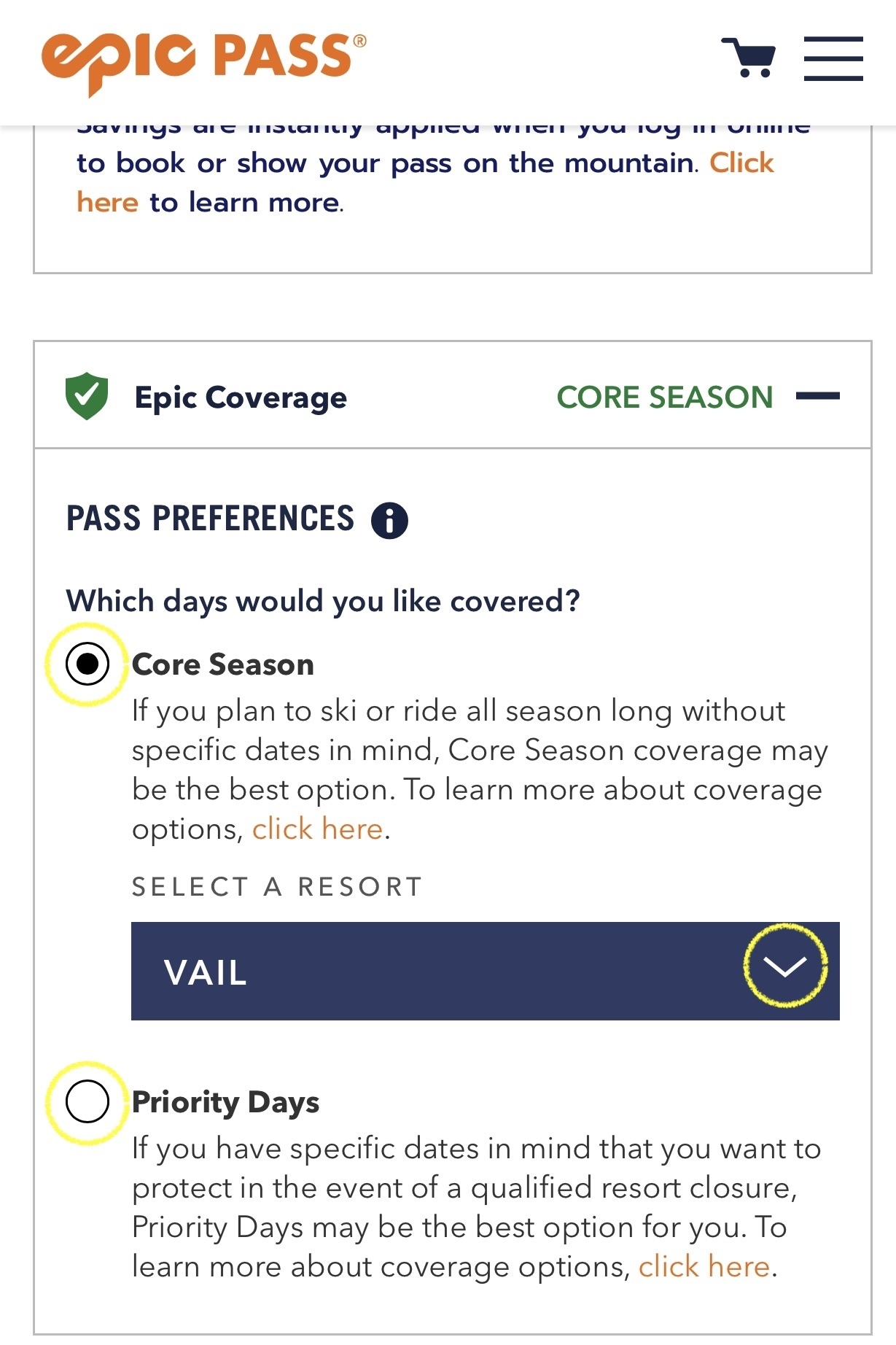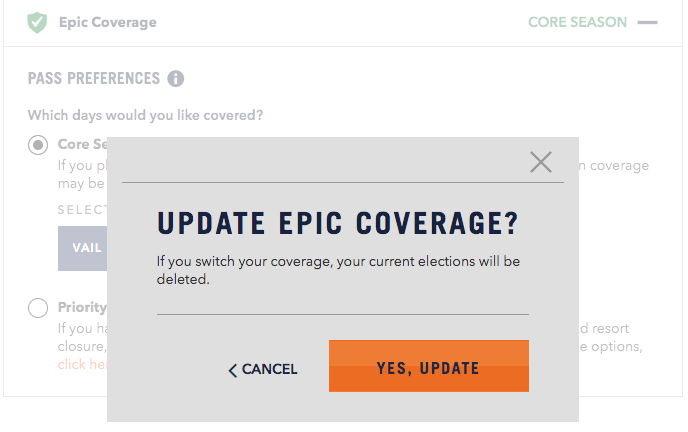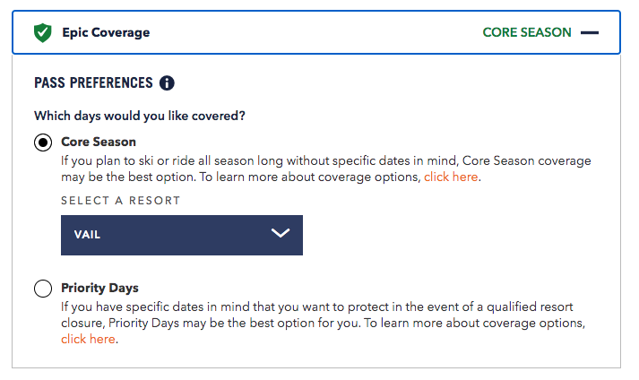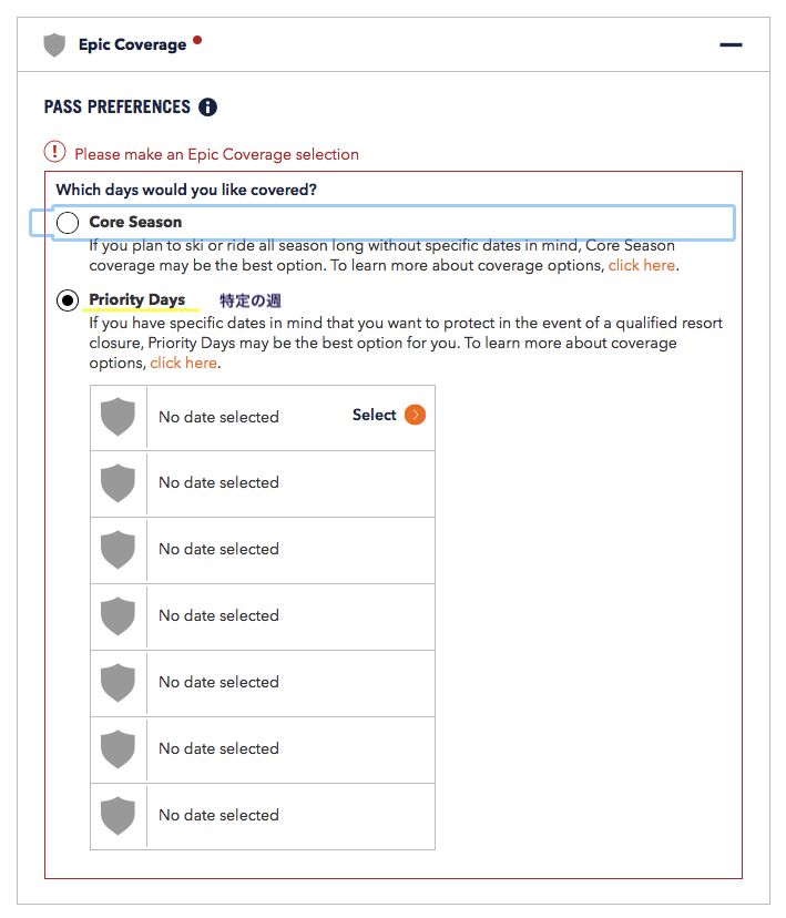 これらのエピック・カバレッジの選択は、パスのアクセスには影響しません。エピック・カバレッジに関する選択は、対象となるリゾートの閉鎖が発生した場合にのみ返金に影響します。