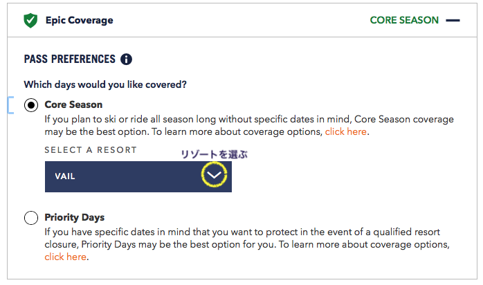 各種パスを購入時は、自動的に「すべてのリゾート」と「コアシーズン」に初期設定されます。