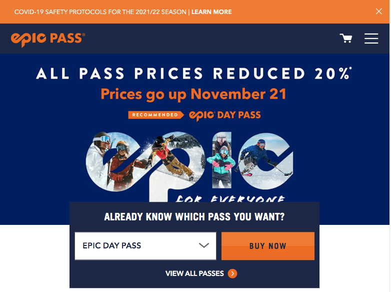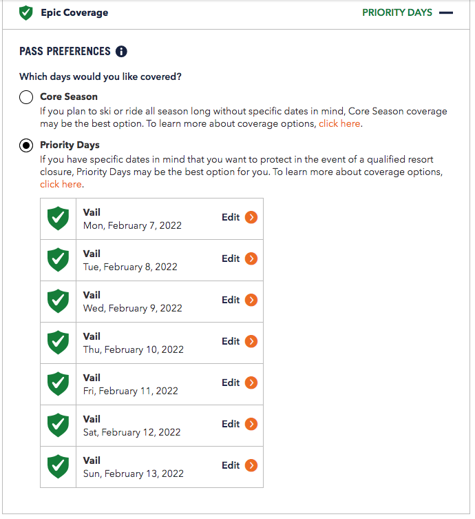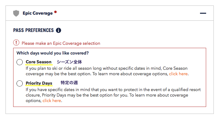 これらのエピック・カバレッジの選択は、パスのアクセスには影響しません。エピック・カバレッジに関する選択は、対象となるリゾートの閉鎖が発生した場合にのみ返金に影響します。