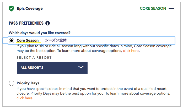 各種パスを購入時は、自動的に「すべてのリゾート」と「コアシーズン」に初期設定されます。